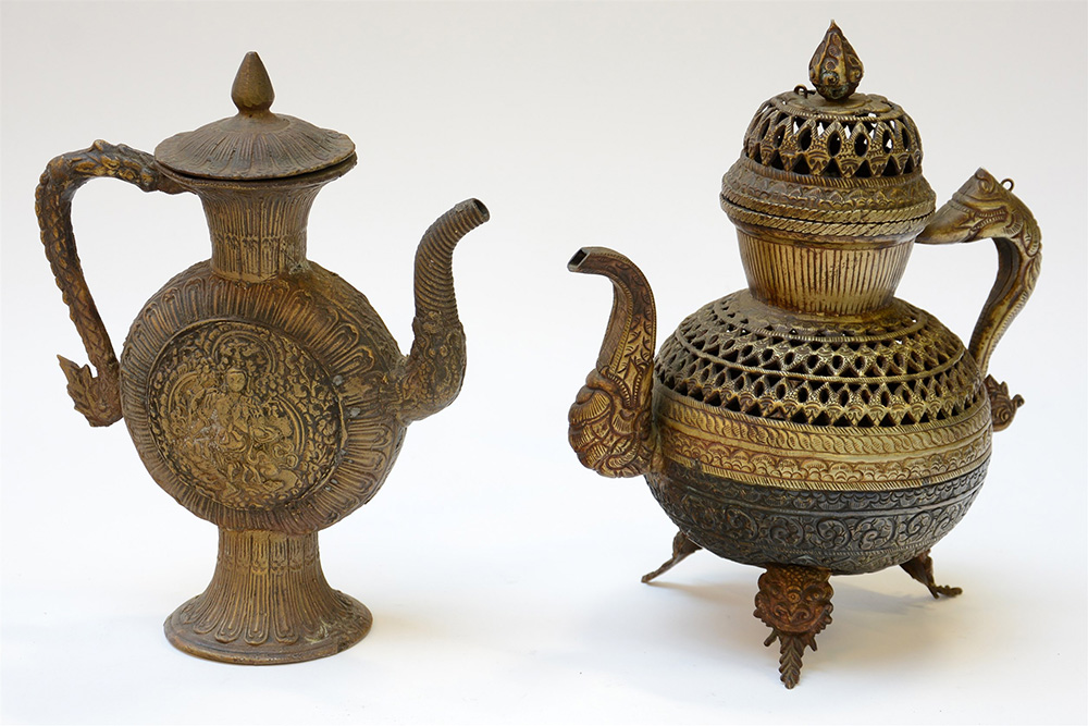 Due versatoi in metallo dorato Manifattura tibetana (h. max 25,5 cm.)-EN.