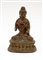 Buddha in bronzo con tracce di lacca e doratura su base a doppio loto (lievi...