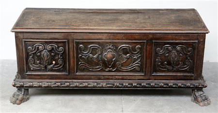 Piccolo cassone in legno dolce a tinta scura con formelle intagliate e sostegni a zampa ferina (cm 120x49x46) (difetti)