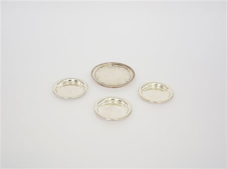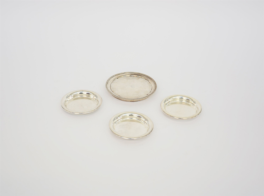 Lotto composto da tre sottobicchieri e un sottobottiglia in metallo argentato