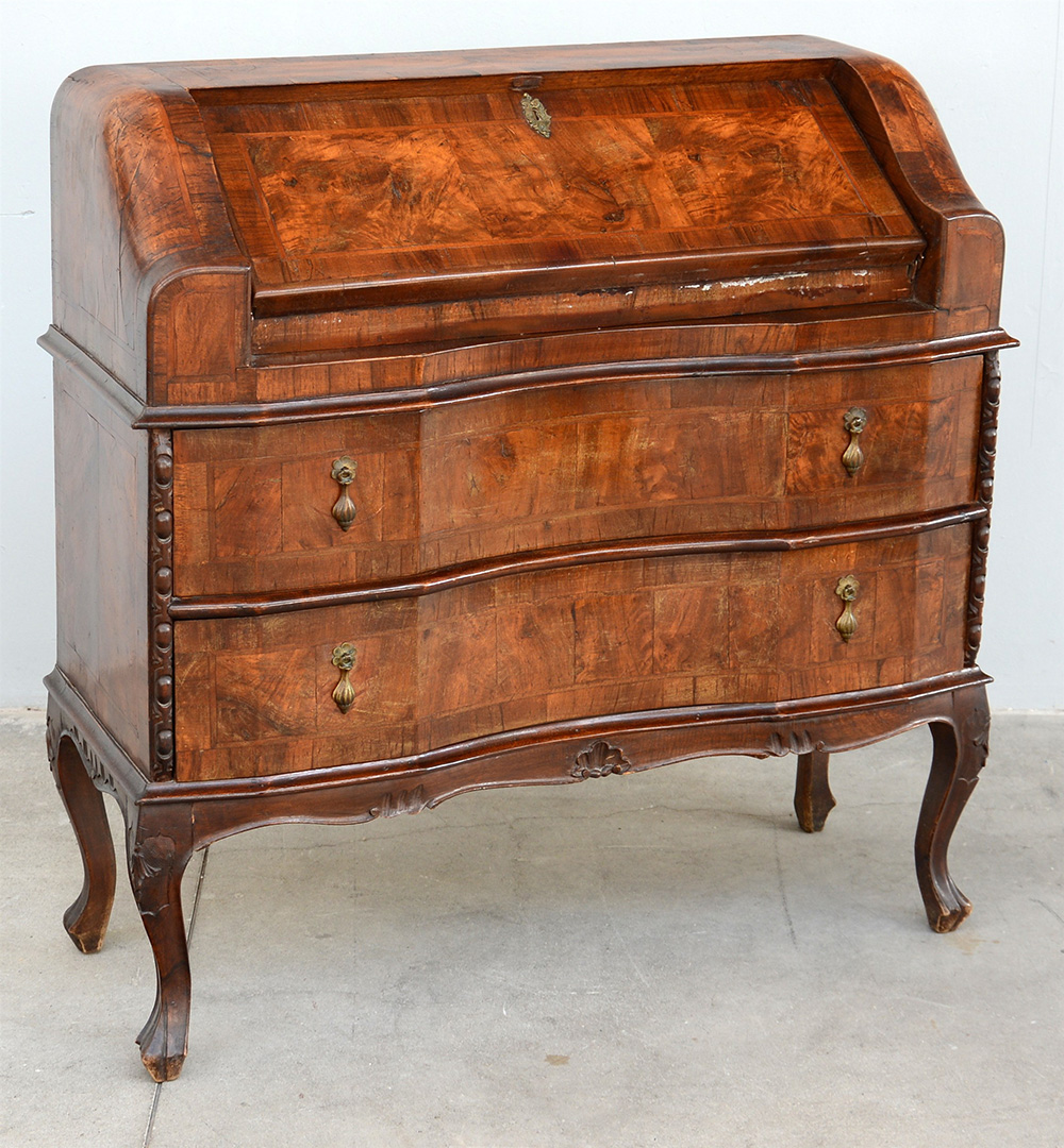 Ribaltina impiallacciata in noce e radica di noce con fronte mossa a due cassetti, prima metà del secolo XX (cm 93x93x36) (difetti)