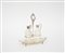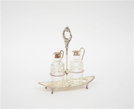 Cruet in metallo argentato e bottiglie con corpo in cristallo