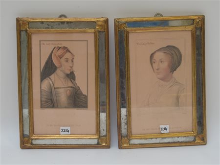 Due cornici in legno dorato con profili e specchio contenente incisioni da Holbein (cm 23x14)