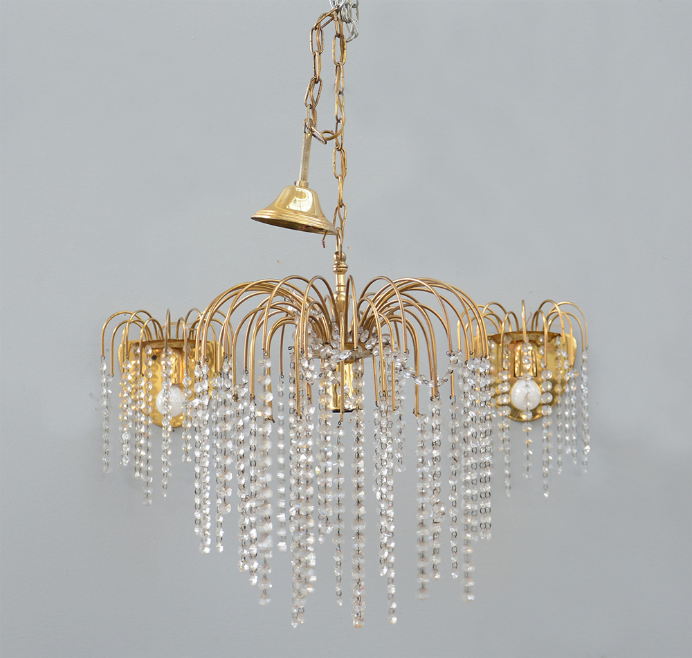 Lotto composto da un lampadario a una luce con struttura in ottone e pendagli a perline, e due abat-jour e suite (difetti)