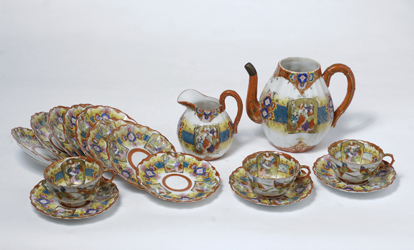 Servito in porcellana dipinta con decori floreali e figure, composto da: 3 tazze, una teiera, una lattiera e 11 piattini (mancanze e rotture) € 200/400