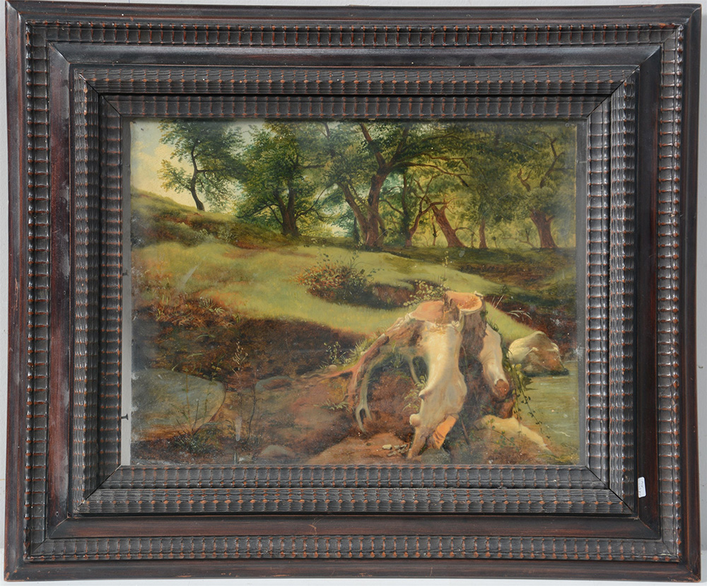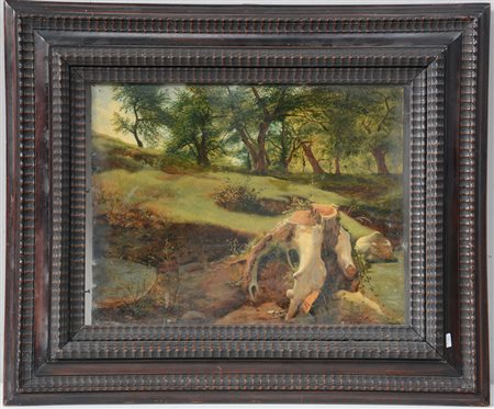 "Paesaggio boschivo" olio su carta (cm 30x40), in cornice. Iscritto al retro (difetti)