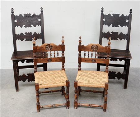 Lotto composto da una coppia di seggiole da balia con schienali a giorno e sedute impagliate (etichette del mobilificio Testa di Bergamo), e una coppia di sedie in legno dolce a tinta scura (difetti)