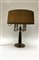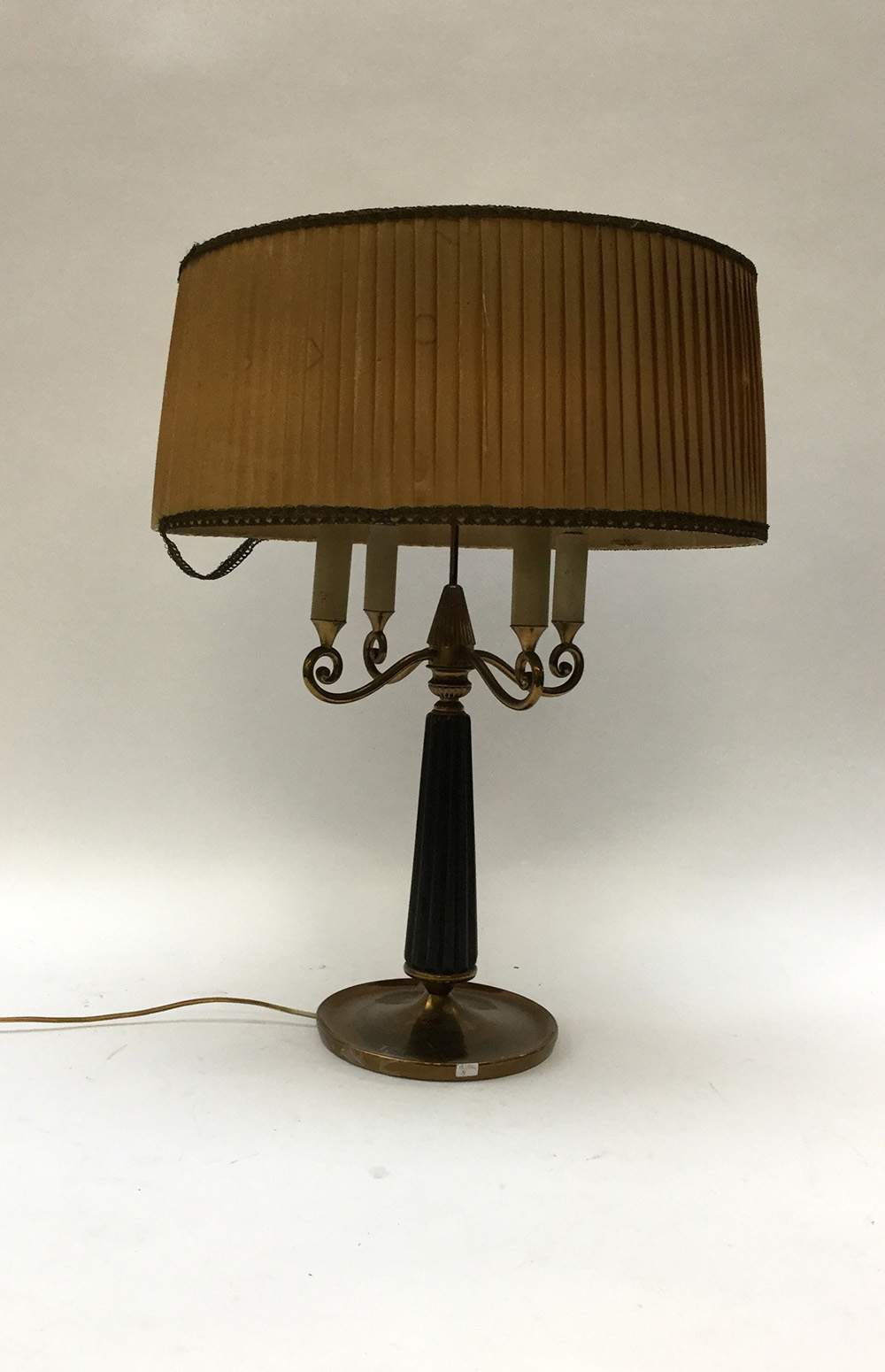 Lampada da tavolo a quattro luci con struttura in metallo dorato e fusto in legno scanalato, completa di paralume (h tot 57) (difetti)