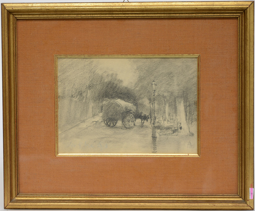 "Scorcio cittadino con carro" disegno a matita su carta(cm 14x20) Siglato in basso a destra. In cornice