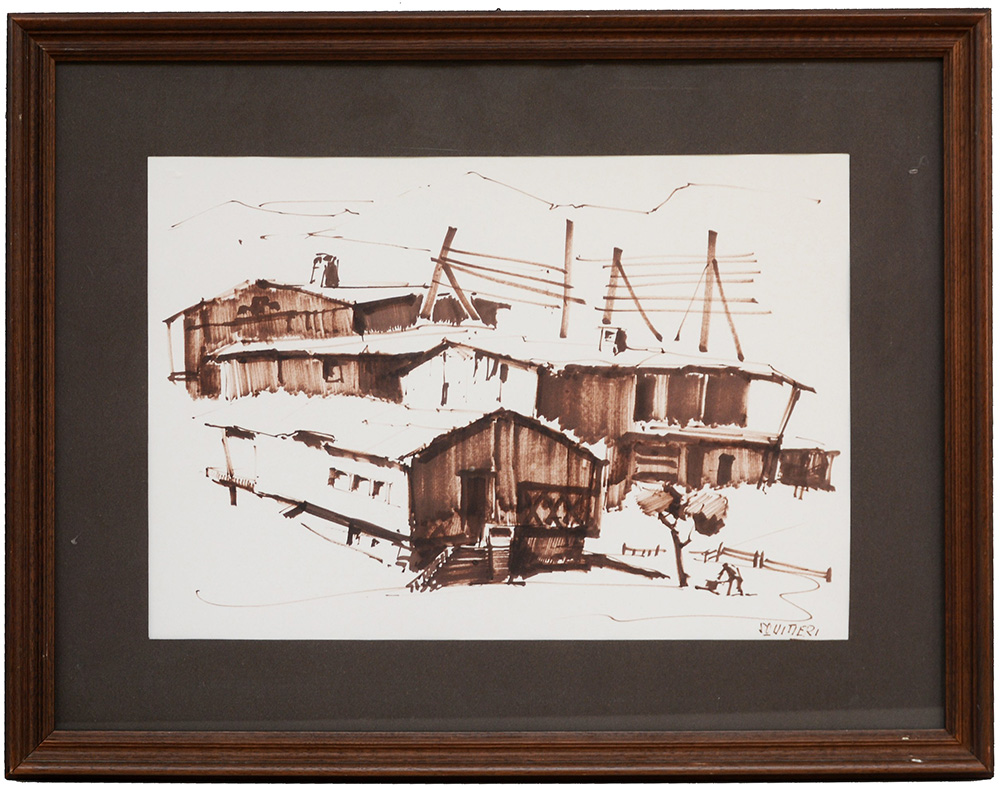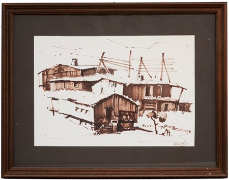 "Case" disegno a pennarello (cm 33x48) firmato in basso a destra, in cornice (difetti)