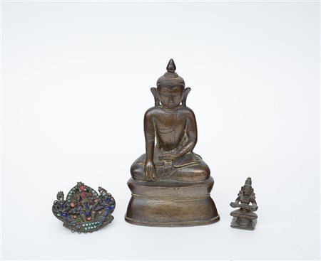Lotto composto da due sculturine in bronzo raffiguranti divinità e un ornamento con pietre. Manifattura orientale