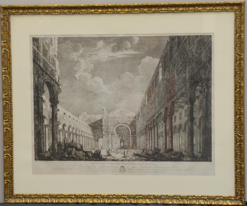 "Resti della Basilica di San Paolo dopo l'incendio" incisione in rame (cm 69x84) datata Roma 1827, in cornice.