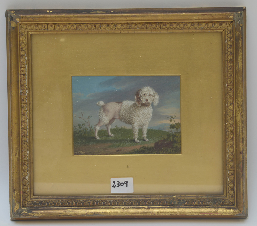 Serafino Casaretti (Secolo XIX) "Barboncino" tempera su cartoncino (cm.9X12,5) firmato in basso a sinistra, iscritto al retro. In cornice