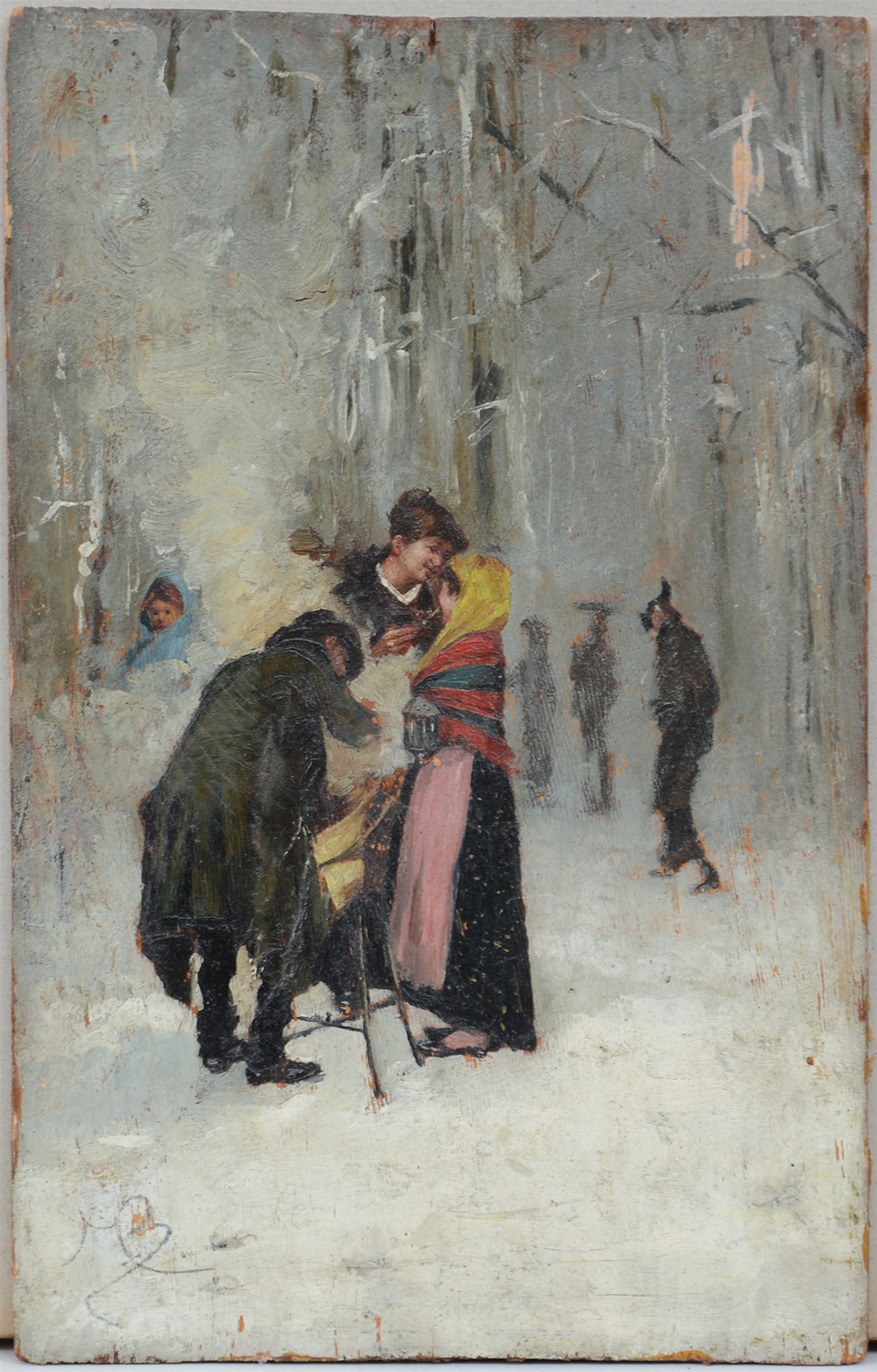 Scuola del secolo XIX, "Il venditore di caldarroste" olio su tavoletta (cm 30x19) siglato M. B. in basso a sinistra (difetti)