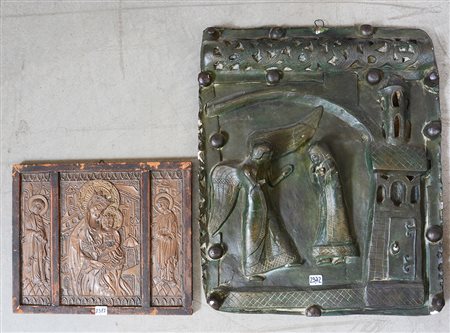 Lotto composto da un altorilievo in ceramica raffigurante L’Annunciazione (cm 55x46) e un trittico in rame sbalzato raffigurante “La Madonna in Maestà tra Santi” (cm 29x35) (difetti)