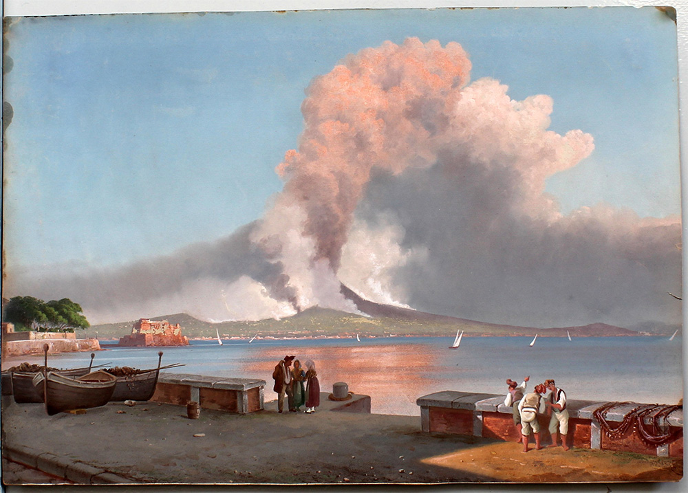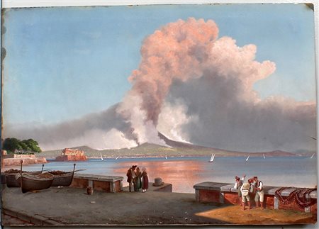 Scuola napoletana secolo XIX "Eruzione del Vesuvio" gouache su carta (cm 44x63) (difetti)