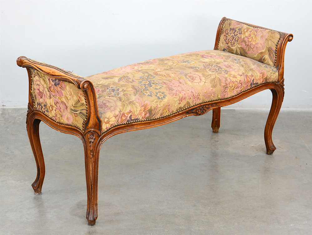 Panchetto in noce intagliato con gambe mosse e rivestimento in tessuto operato (l cm 115) (difetti)