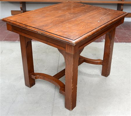 Tavolo rettangolare con quattro gambe a pilastro riunite da traversa, anni ’20 del secolo XX (cm 100x82x80)(difetti)