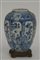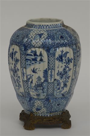Manifattura del sec. XIX. Base per lampada in porcellana decorata nei toni del blu a paesaggi. Ghiera in metallo dorato (difetti)
