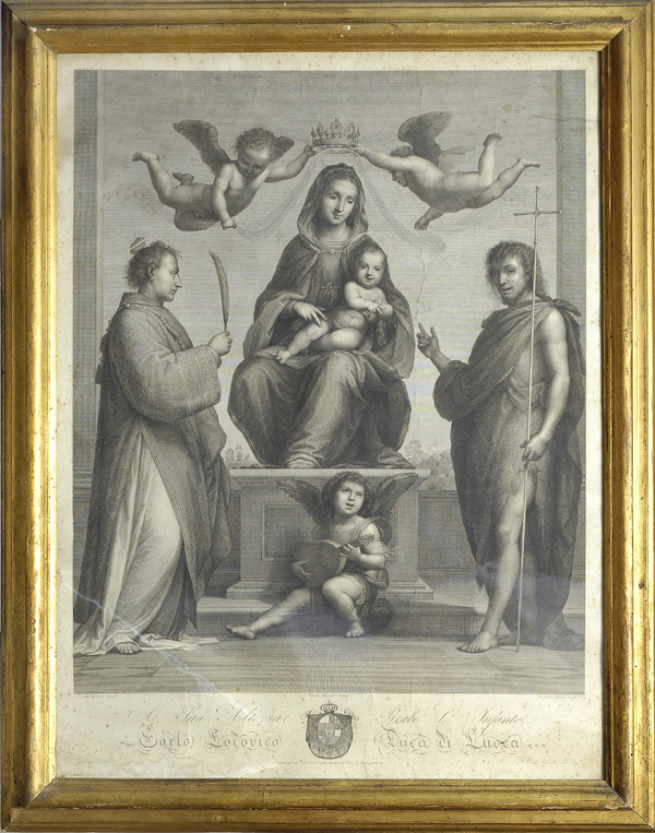 Sacra conversazione stampa da Frà Bartolomeo, cornice in legno dorato, cm. 72x55 € 210/310