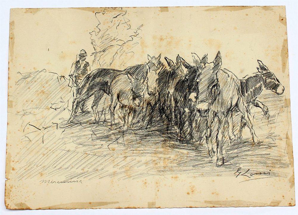 Giovanni Lomi (Livorno 1889 - 1969)"Contadino e muli" carboncino su carta (mm...