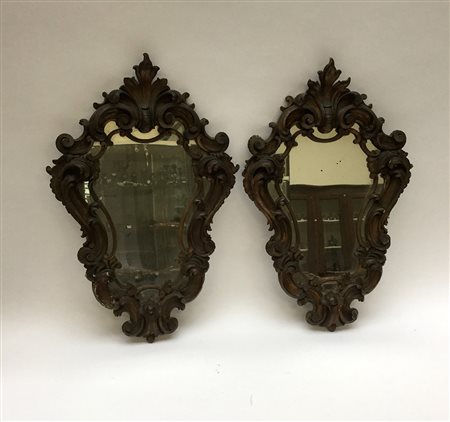 Coppia di specchiere di gusto rocaille in legno intagliato (cm 41x63) (difetti e mancanze)