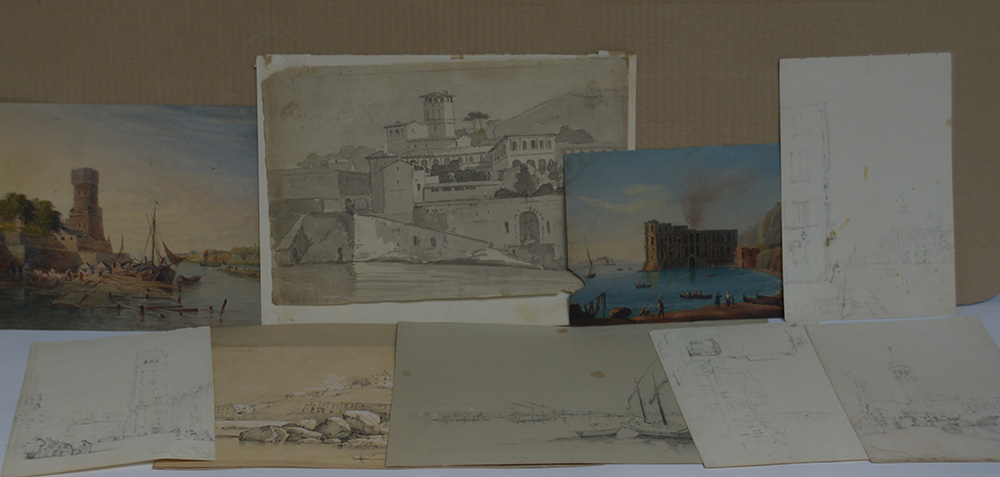 Gruppo di dieci disegni e dipinti del sec. XIX raffiguranti scorci di città...