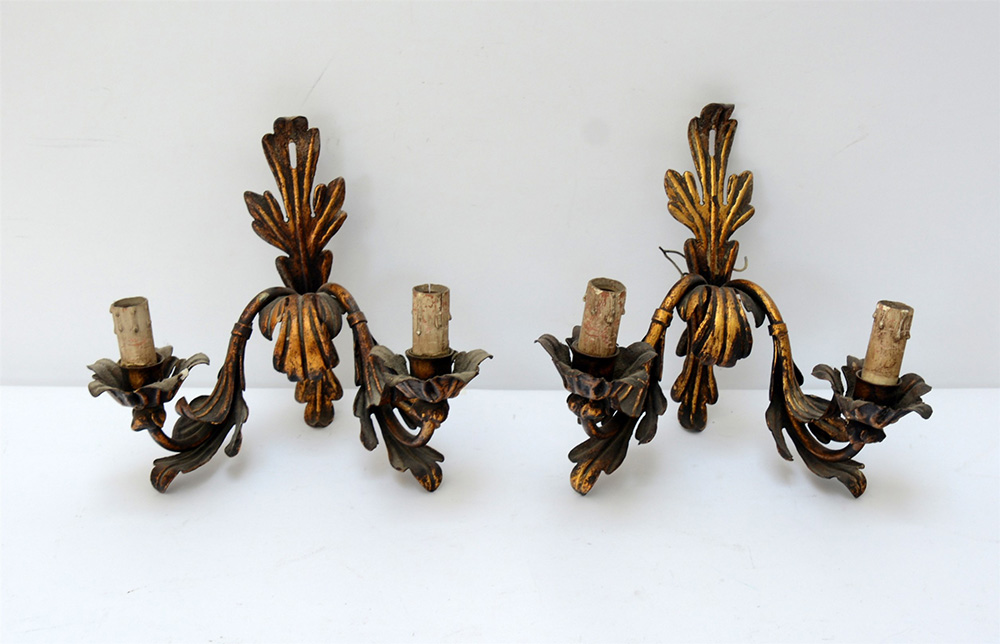 Coppia di appliques a due luci in metallo a guisa di foglie (difetti)