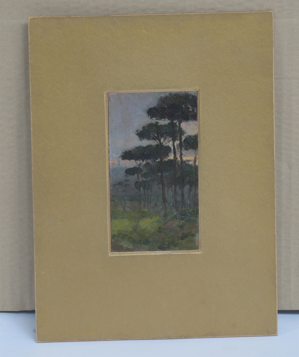 "Paesaggio con alberi" olio su tavoletta (cm 13,5x7) firmato al retro. Timbri coll. Girace e Meoni Ferrara