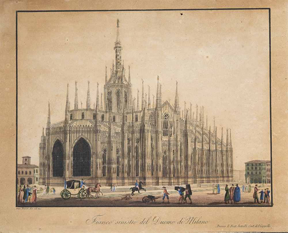 Giacomo Bussi"Fianco sinistro del Duomo di Milano" incisione acquarellata su...