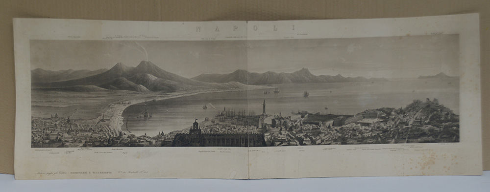 Incisione a volo d'uccello raffigurante il Golfo di Napoli. Edizione Genevresi e Vallenzasca, Milano, sec. XIX (cm 33x96) (difetti)