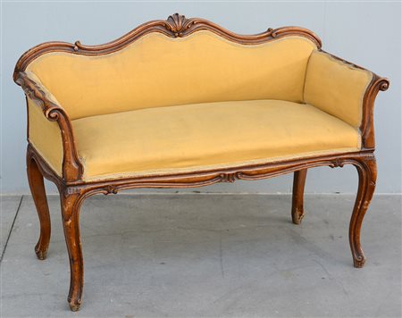 Divanetto in legno intagliato di forma mossa (l cm 98) (difetti)