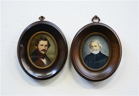 Lotto di due miniature ovali dipinte ad olio raffiguranti Giuseppe Verdi e un...