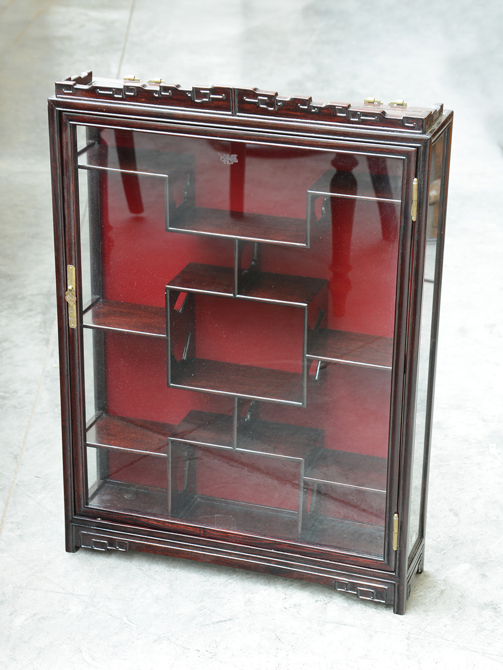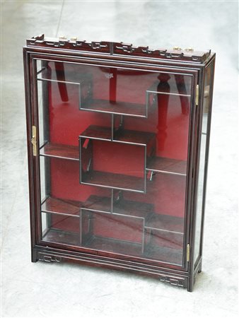 Vetrinetta da esposizione in legno e vetro con anta apribile, l'interno con mensole simmetriche, fregio e motivi floreali (difetti)