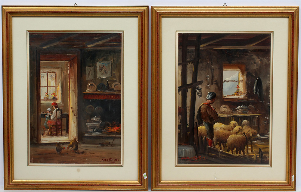 Mario Fattori (1930)"Scene d'interno" coppia di dipinti ad olio su cartone...