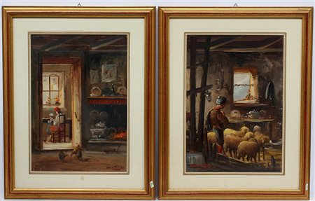 "Scene d'interno" coppia di dipinti ad olio su cartone telato (cm 34x24) in cornici