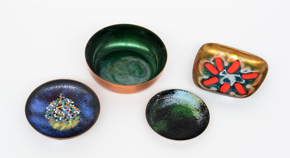 Lotto composto da quattro posaceneri in rame smaltato di manifatture e decori diversi. Itaia e Germania, anni '60. (difetti)