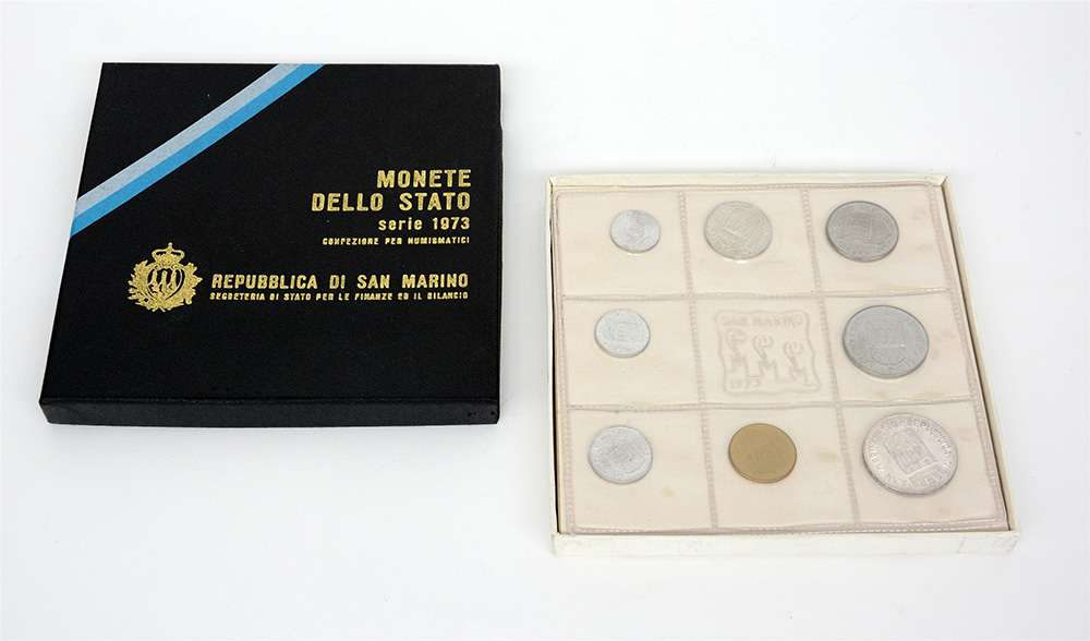 Monete commemorative della Repubbilca di San Marino, 1973 (d max cm 1) in astuccio originale (difetti)