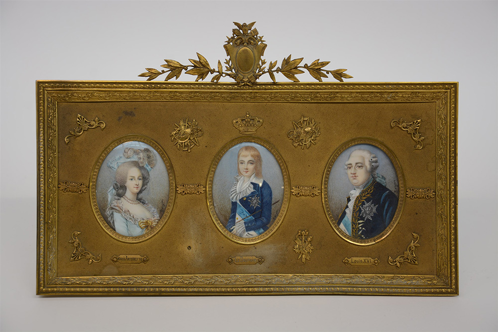 Cornice in bronzo dorato contenente tre miniature ovali raffiguranti Luigi XVI, Maria Antonietta e il Delfino, firmate Berger (cm 23x36) (difetti e mancanze)