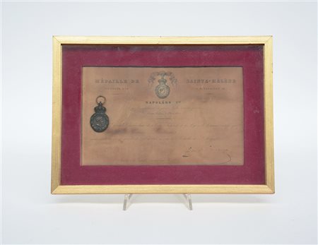 Medaglia di Sant'Elena con relativo brevetto di assegnazione, prima metà sec. XIX (cm 36x26) contenuto in cornice moderna (difetti)