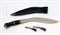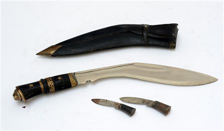 Pugnale nepalese Kukri con forte lama prodotta in india, compreso di fodero in legno e cuoio e due piccoli coltelli (l. cm 45) (difetti)