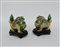 Coppia di leoni buddhisti in ceramica a smalti Famiglia Verde su base in legno (difetti)