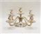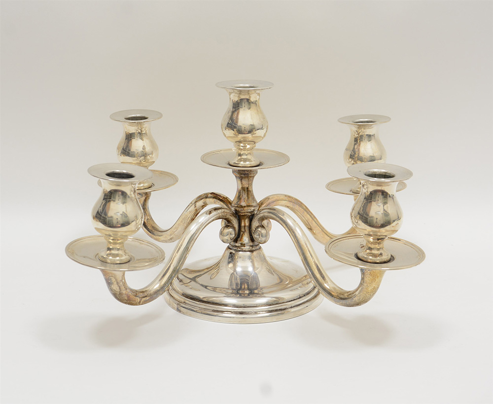 Candelabro in argento a cinque fiamme con base circolare gradinata, fusto a rocchetto, bracci a voluta e bobeche a balaustro. Padova, secolo XX (h. cm 23) (g 1840 ca.)(difetti)