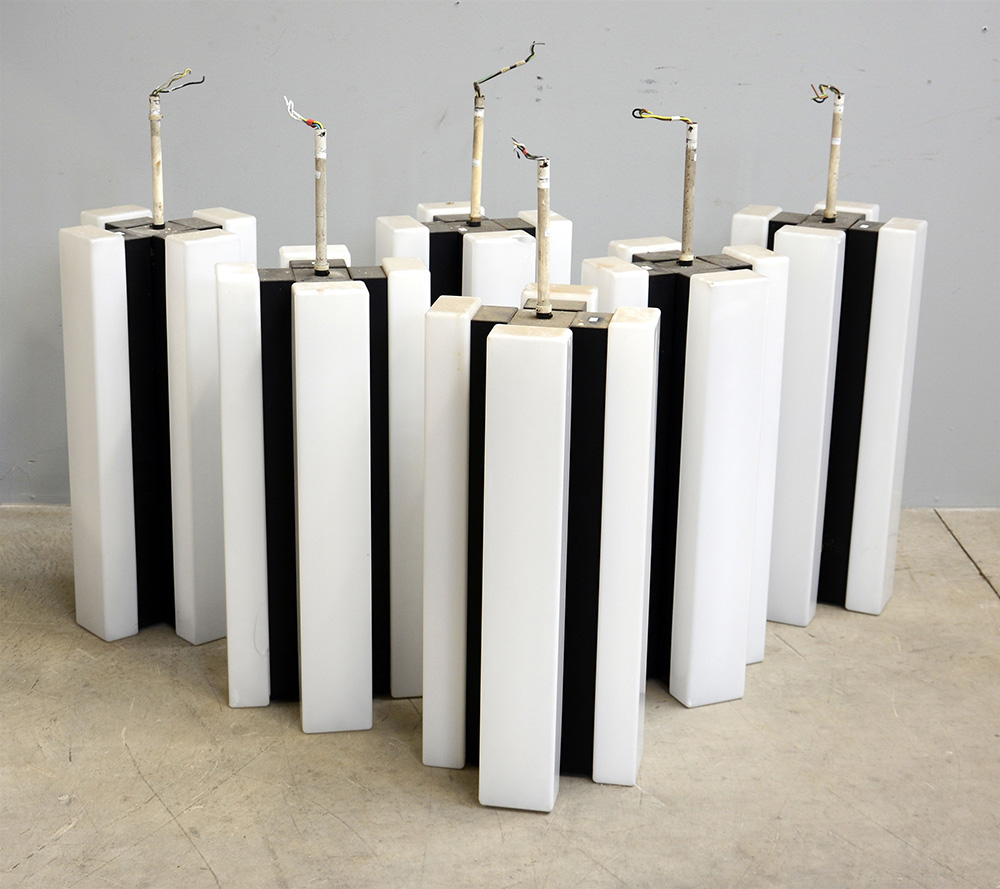 Lotto composto da sei lampade a sospensione a croce. Produzione Trilux, anni '70. Metallo laccato bianco e plexiglass. (cm 30x66x30) (gravi difetti)