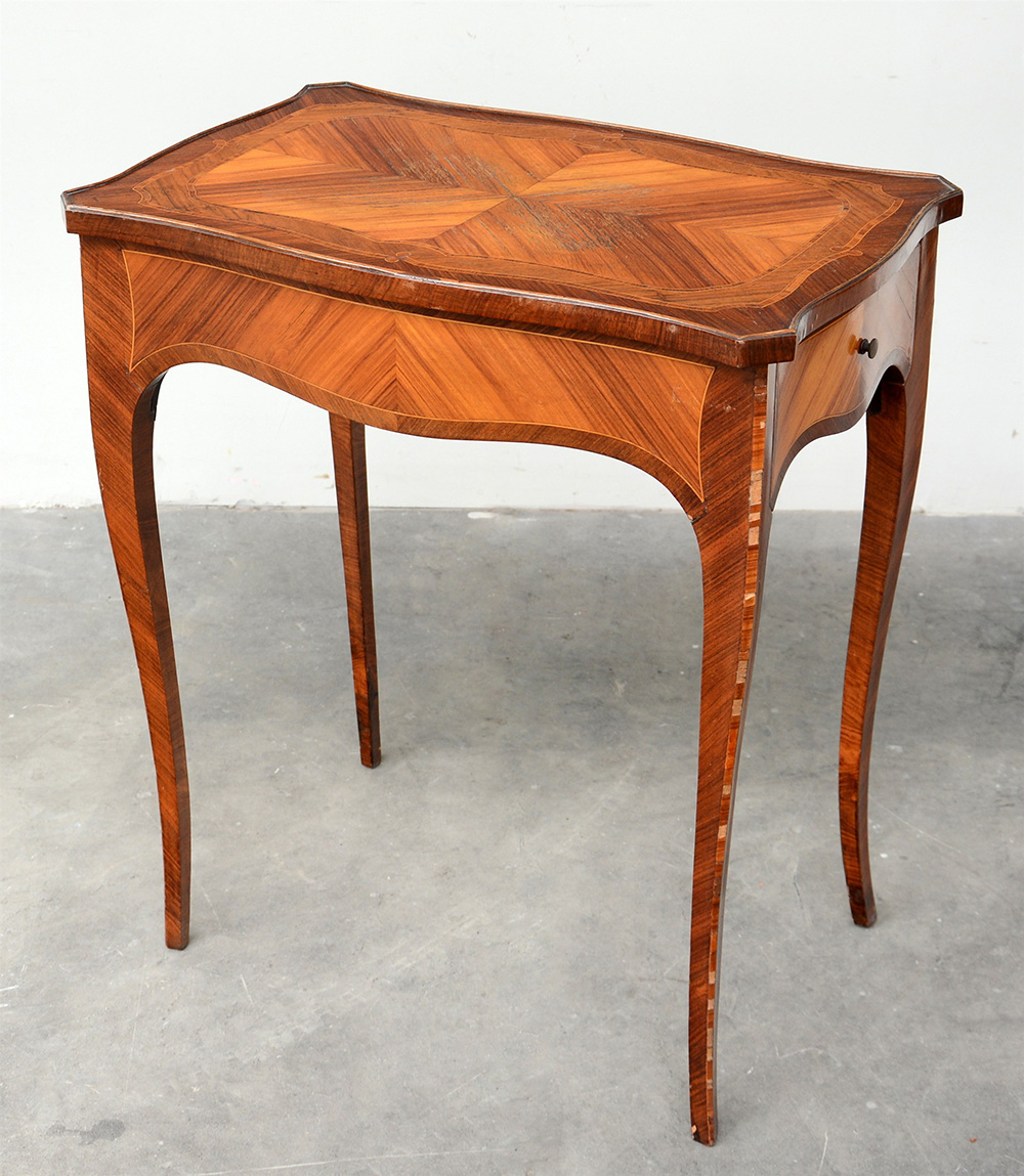 Tavolino da centro lastronato in bois de rose e bois violet con cassetto sottopiano, tiretto laterale, quattro gambe mosse (cm 64x74x42)(difetti)