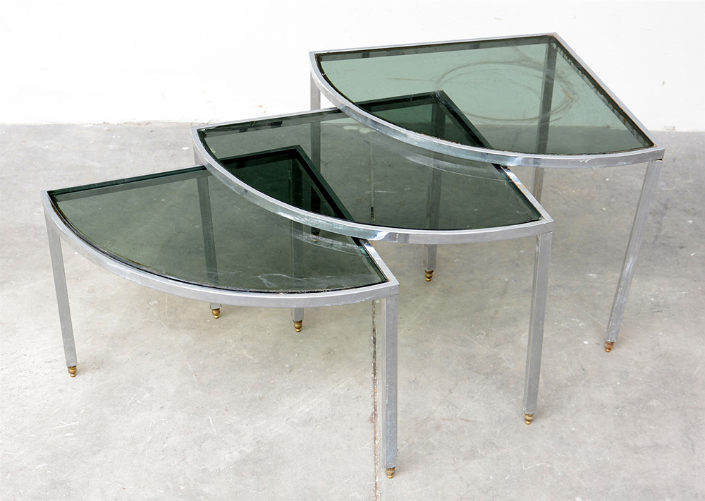Gruppo di tre tavolini angolari impilabili in metallo cromato e con piano in vetro fumè. Italia, anni'70. (cm 66x40x51)(gravi difetti)