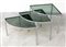Gruppo di tre tavolini angolari impilabili in metallo cromato e con piano in...