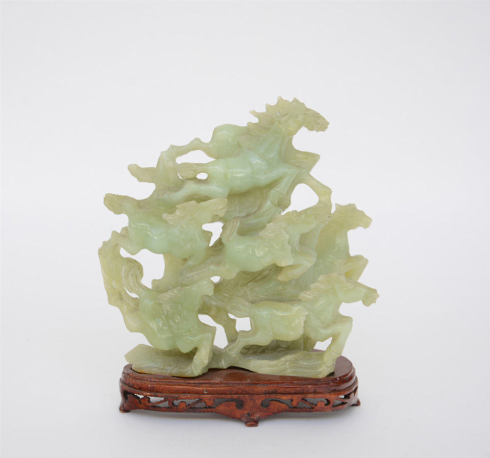 Gruppo scultoreo in pietra dura raffigurante cavalli in corsa, base in legno (difetti)