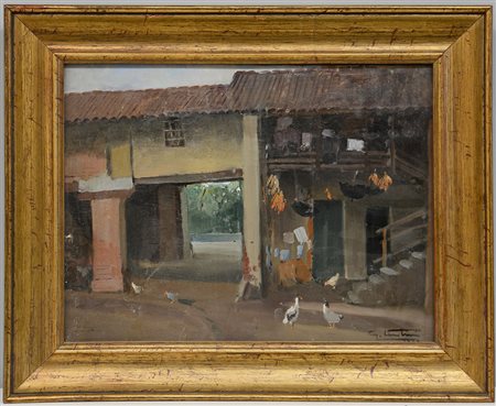 "Cortile" 1930, olio su compensato (cm 36x48) firmato e datato in basso a destra e titolato al retro, in cornice