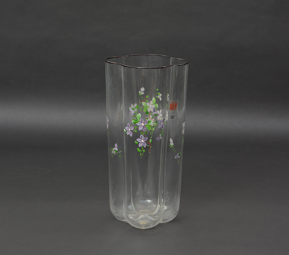 Vaso in vetro di forma quadrilobata dipinto con fiori. (h cm 32) (difetti)